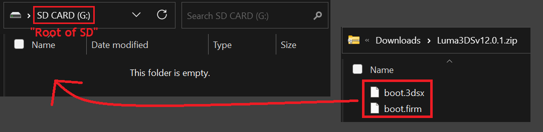 When copying files to the SD card, it is important to copy them to the right location - otherwise, the console will not detect the file and the exploit or software you are trying to use will not work. A term you will see frequently on this guide is root of the SD card, which means you are not inside any folder on your SD card. The directory that appears when you first open your SD card on your computer is called the 'root'.